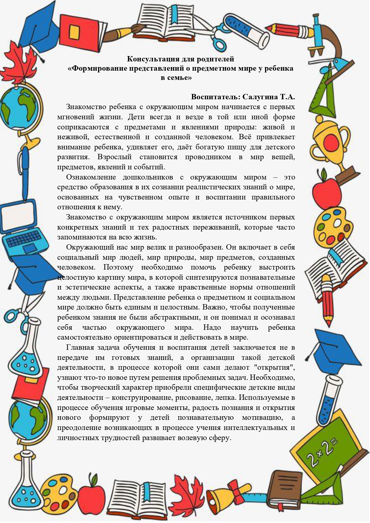 Консультация для родителей "Формирование представлений о предметном мире у ребенка в семье"